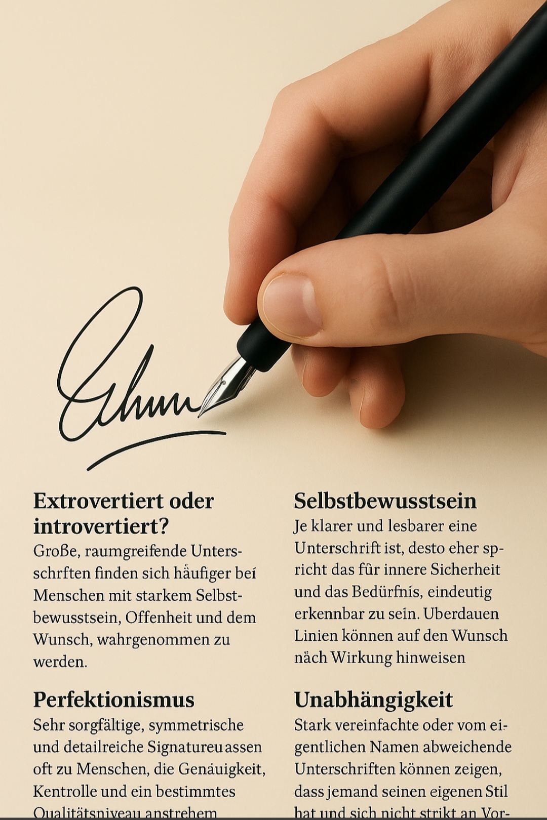 Die aktuelle Forschung bleibt dabei erstaunlich bodenständig. Sie sagt im Kern aus, dass wir aus einer Unterschrift Tendenzen ableiten können, keine Schicksale. Wir können sehen, ob jemand eher zur Bühne oder zur Deckung neigt. Wir können erkennen, ob eine Person sehr gern Spuren hinterlässt. Wir können sogar Zusammenhänge zum Entscheidungsverhalten sehen, etwa dass Führungskräfte mit besonders dominanten Signaturen häufiger zu großen, manchmal übergroßen Investitionen neigen. Aber sie sagt ebenso deutlich, dass eine Unterschrift nur ein Puzzleteil ist, kein Röntgenbild der Seele. Wer nur die Signatur anschaut und den Menschen nicht, der macht es sich zu leicht. Genau das ist der Punkt, der für uns spannender ist als jede Statistik. Denn die eigentliche Frage lautet doch hier, warum schreibe ich so, wie ich schreibe? Warum lasse ich den Anfangsbuchstaben wie einen kleinen Thron dastehen und den Rest nur andeuten? Warum ist mein Nachname nur noch eine Welle, als wollte ich sagen: „Wer mich kennt, weiß eh, wer ich bin?“ Warum streiche ich alles zweimal durch, als müsste ich mich gegen etwas absichern? Warum mache ich am Ende einen Schwung, der nichts mehr mit meinem Namen zu tun hat, aber ganz viel mit meinem Bedürfnis, einen Akzent zu setzen? In diesen kleinen Eigenheiten steckt unsere Biografie, unsere Erziehung, unsere Erfolge, unsere Kränkungen. Viele von uns haben gelernt, nicht zu protzen. Manche haben gelernt, sich groß zu machen, bevor es jemand anders tut. Manche mussten immer zeigen, dass sie es verdient haben, hier zu unterschreiben. Andere wurden so selbstverständlich gesehen, dass sie gar nicht mehr daran denken, sich klein zu machen. Und hier beginnt der Teil, der über die Forschung hinausgeht und in die persönliche Erkenntnis führt. Wer seine Unterschrift einmal bewusst betrachtet, sieht oft mehr als nur Kritzeln. Man kann sich fragen, entspricht diese Signatur noch dem Menschen, der ich heute bin? Oder ist sie ein Überbleibsel des Studenten, der noch nicht wusste, dass er später eine eigene Firma gründet? Oder ist sie noch die Unterschrift des schüchternen Mädchens, das nie auffallen wollte, obwohl jene Person heute eine Leitungsfunktion inne hat und täglich Verantwortung trägt?